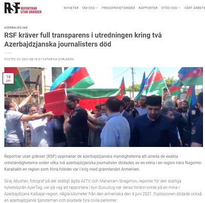 İsveçdəki Azərbaycan diasporunun fəal üzvləri Abdulla Cavanşir Haşimi, Aida Amir Haşimi və Nadir Hollenbrandın təşəbbüsü ilə "Sərhədsiz Reportyorlar" təşkilatının bu ölkədəki nümayəndəliyinin https://www.reportrarutangranser.se saytında Kəlbəcərdə mina partlayışı nəticəsində həlak olan azər