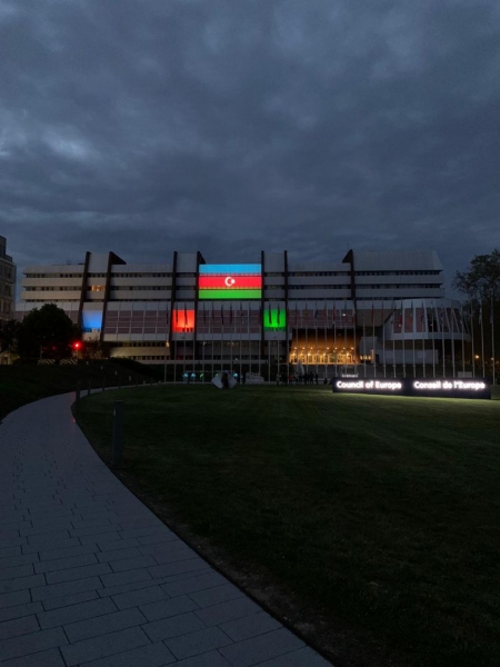 Fransanın Strasburq şəhərində yerləşən Avropa Şurasının baş qərargahı 28 may-Respublika Günü münasibətilə Azərbaycan bayrağının rəngləri ilə işıqlandırılıb.