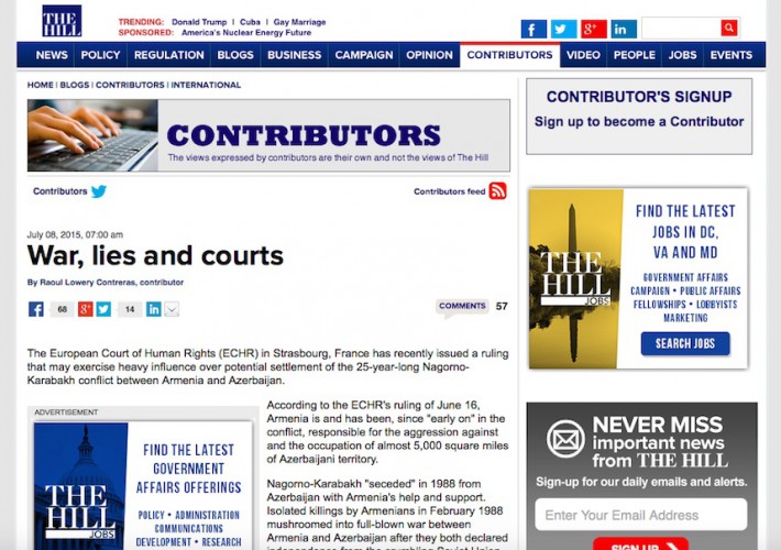 ABŞ-da çıxan “The Hill” qəzetində siyasi şərhçi Raul Kontrerasın “Müharibə, yalan və məhkəmə” sərlövhəli məqaləsi dərc olunub (http://thehill.com/blogs/pundits-blog/international/247133-war-lies-and-courts). Məqalədə Ermənistan-Azərbaycan münaqişə