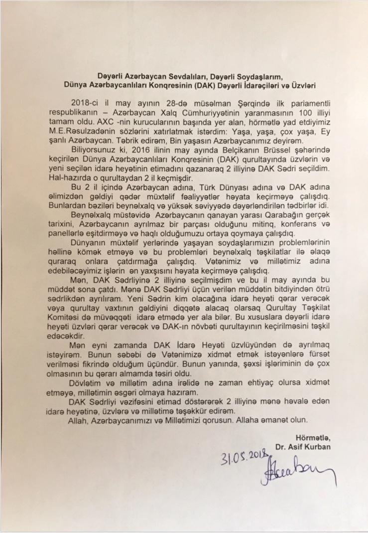 Dünya Azərbaycanlıları Konqresinin (DAK) sədri Asif Kurban sədrlikdən ayrıldığı barədə bəyanat yaymışdır.