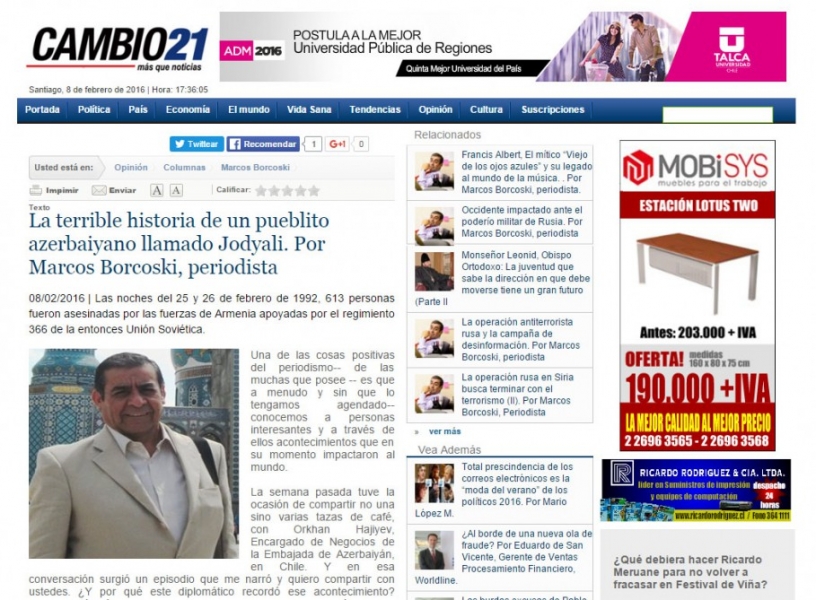 Çilidə televiziya və radio jurnalisti kimi tanınan, Santiaqonun “Andres Bello” Universitetinin professoru Markos Borkoski Paezin Çilinin “Cambio 21” xəbərlər portalında “Xocalı adlı Azərbaycan şəhərinin dəhşətli tarixi” başlıqlı yazısı dərc edilib.&n